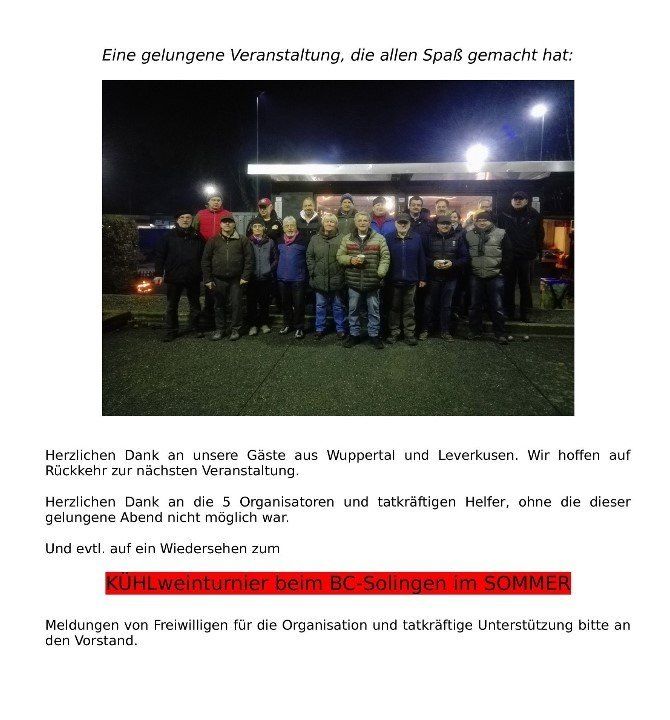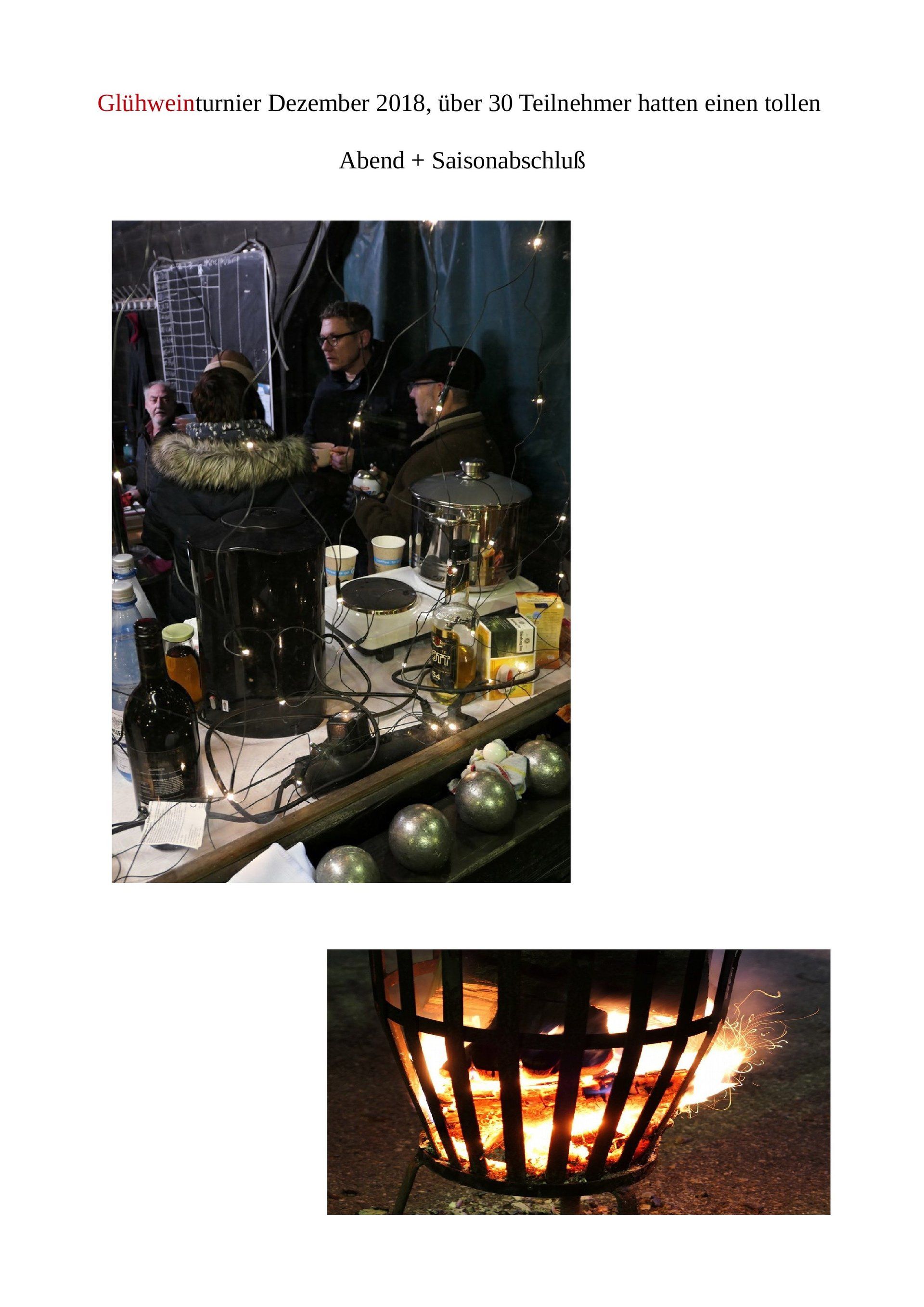 Im Dezember findet, ich denke zur Freude aller, wieder das Glühweinturnier statt. Coronabedingt musste dies leider längere Zeit ausfallen. Ich bin mir sicher, dass dieses regen Anklang findet und alle Teilnehmenden zum Gelingen beitragen werden.